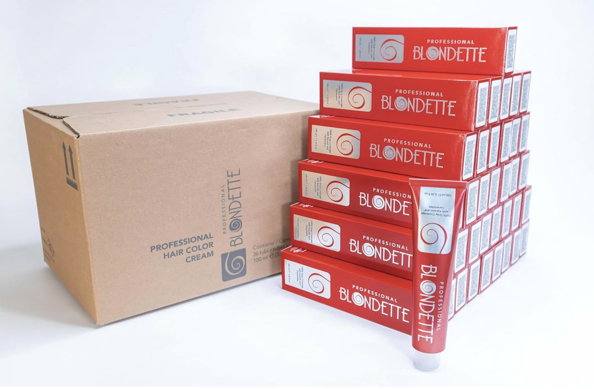Blondette Professional Permanent Hair Color 36-Pack (100 ml each, 3.38 oz, 8.5 lbs total) with 100% gray coverage, keratin & ceramides. Made in Italy, multiple shades. 1-year warranty.